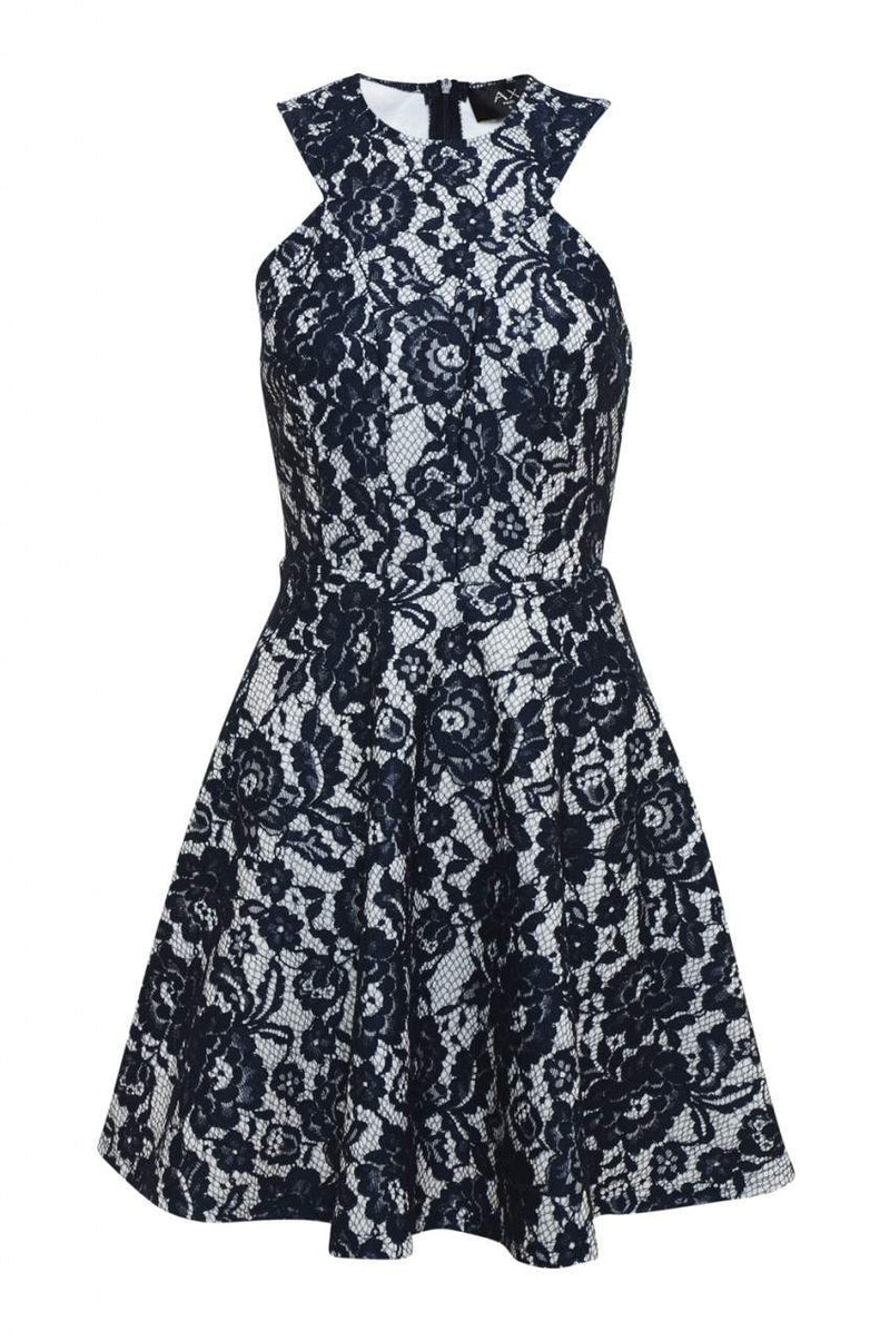 This all over crochet lace skater dress is perfect for any occasion! This contrasting navy and white style with its cut in neck will show off your pins and accentuate your waist! Simply pair with some heels and a clutch for a look all your friends will envy!