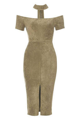 This khaki off the shoulder choker dress with capped sleeves is great for a girls night out. Style with your favourite pair of heels and feel amazing!