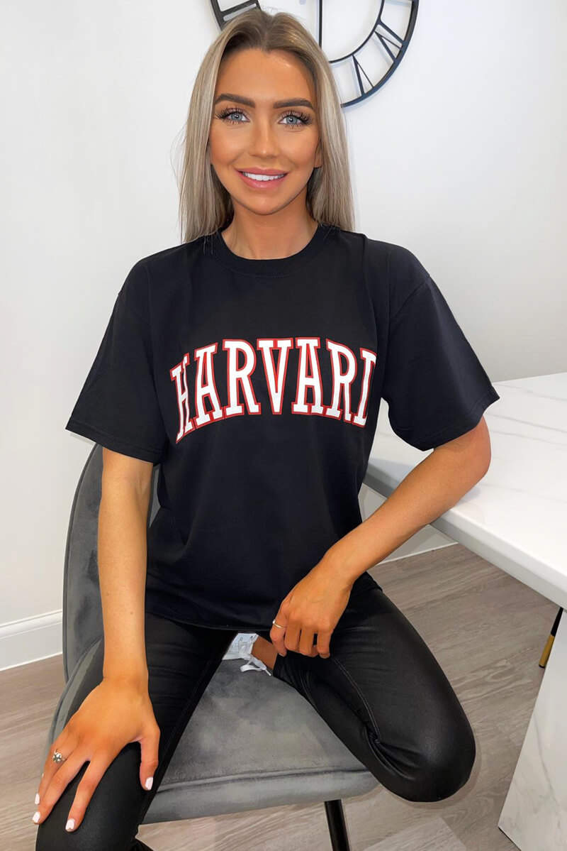 Our Black  Harvard Oversized Tee is bang on trend this season! With an oversized fit and graphic design, wear it with our joggers for a cosy casual look  or glam it up with jeans and heels for drinks with the girls!
