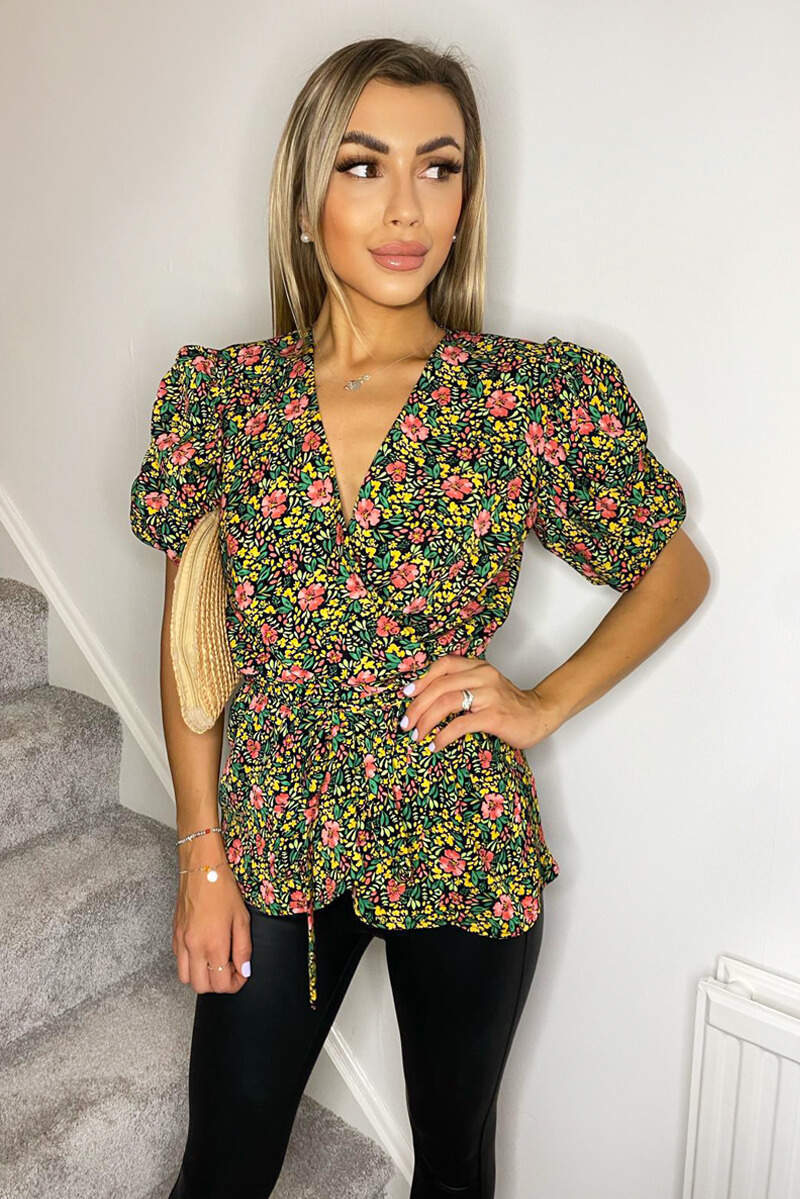 Brighten up your summer wardrobe with this Floral Printed Ruffle Puff Sleeve Wrap Top. Featuring short ruffle puff sleeves, a wrap over style and a tie waist. Pair with jeans and sandals for a cute daytime look.