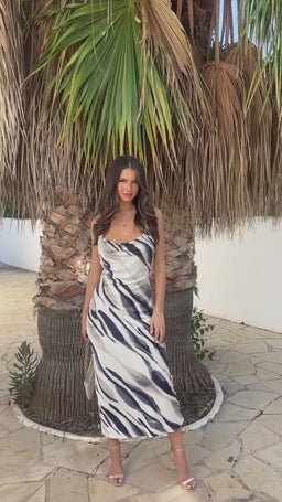 Embrace your glamorous side with our Navy and Cream Stripe Print Strappy Twist Back Slip Midi Dress. Featuring our stunning satin-feel fabric with lining, a cowl neckline, a strappy twist back, a zip-up side and a fully lined midi skirt. Style with heels and a matching bag for the perfect summer evening outfit.