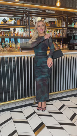 Look and feel gorgeous in our Teal And Black Smudge Print Mesh Overlay Long Sleeve Midi Dress. Featuring a bodycon silhouette, a round neck, long mesh sleeves, attached mini slip lining and a ruched maxi length mesh skirt with side split. Pair with minimal jewellery and heels for a stylish evening look.