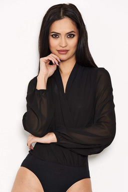 This is our black mesh long sleeved bodysuit. Featuring a fitting shape and deep plunge neckline this bodysuit Is for sure to show off all the curves you want too flaunt. Style with wide leg trousers or skinny jeans and barely there heels for a simple but chic look!