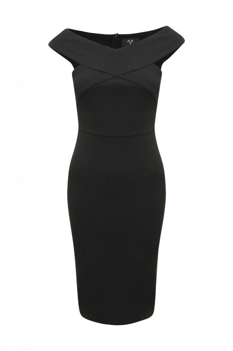Ooze sophistication this season in this black bardot dress! This cross top midi style with its bodycon shape is sure to show off your curves. Simply pair with heels and a clutch for a glam look that ll draw all eyes to you!