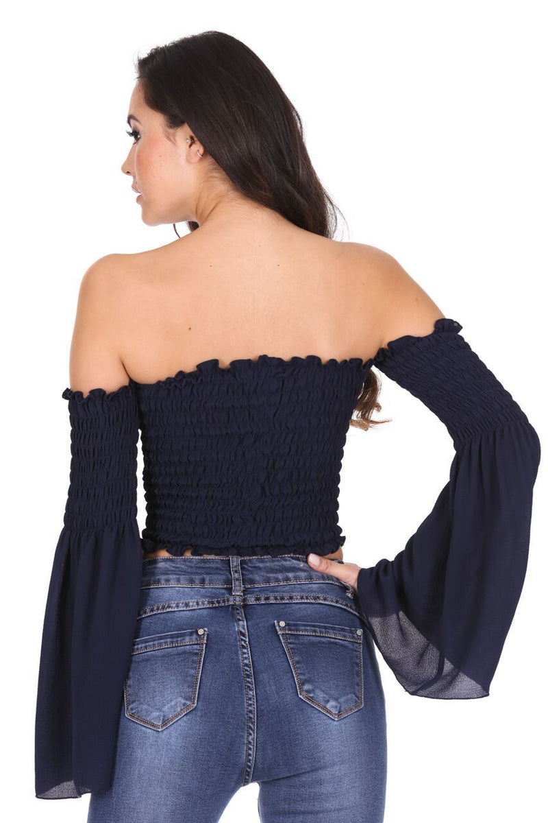 Our cute but sexy navy crop top with long flare arms is a must have, perfect for the summer but also trans-seasonal. Match with a pair of high waisted shorts for a show stopping outfit or for cooler weather add a pair of your favorite skinnies!