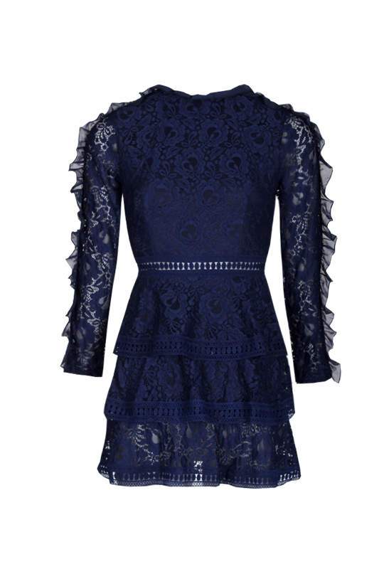 This navy long sleeved lace mini dress is perfect for this season! With a multi layered skirt and ladder crochet frill detail on the sleeves, it s that unique piece you ve always been looking for!